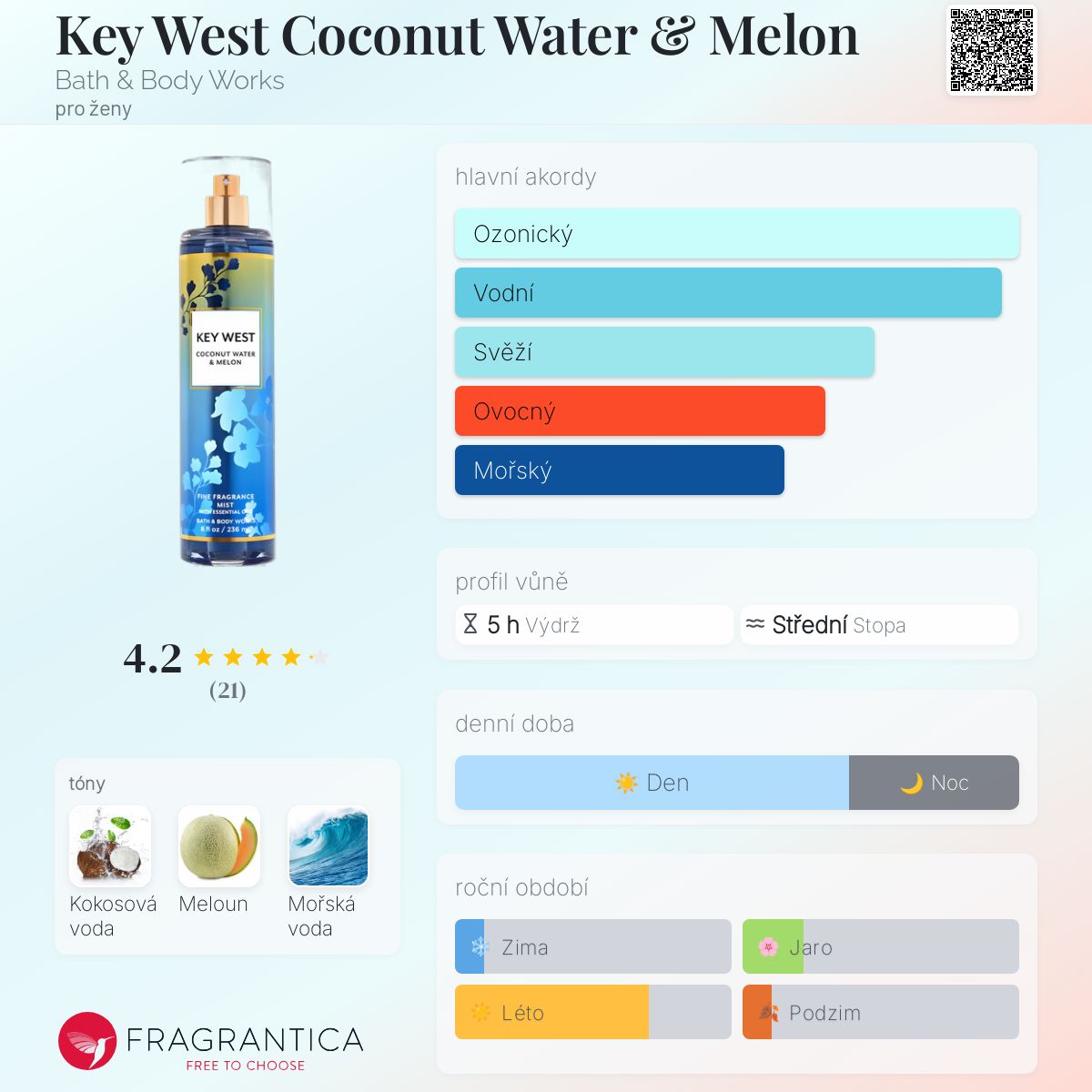 Key West Coconut Water & Melon podle Bath & Body Works je Aromatic Fruity vůně pro ženy. Key West Coconut Water & Melon byl/a uveden/a v roce 2021.