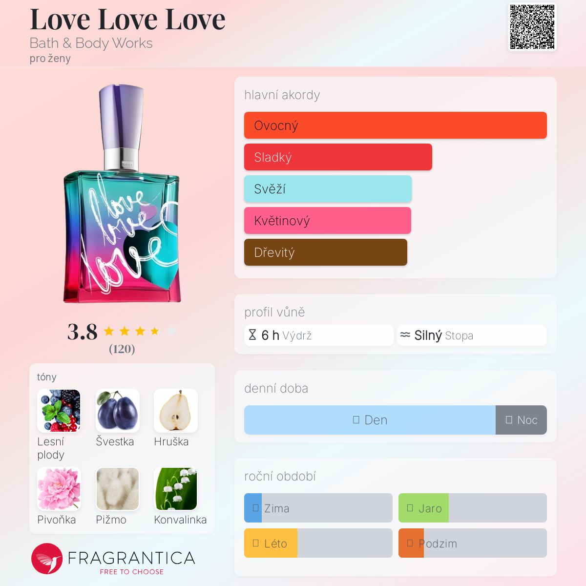 Love Love Love podle Bath & Body Works je Floral Fruity vůně pro ženy. Love Love Love byl/a uveden/a v roce 2012. Vrchní tóny jsou Lesní plody, Švestka a Hruška; střední tóny jsouPivoňka, Konvalinka a Frézie ; základní tóny jsou Pižmo a Dřevité tóny.