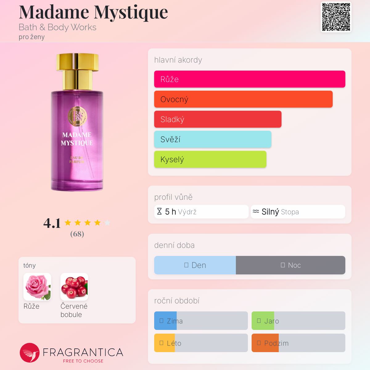 Madame Mystique podle Bath & Body Works je Floral Woody Musk vůně pro ženy. Toto je nová vůně. Madame Mystique byl/a uveden/a v roce 2025.
