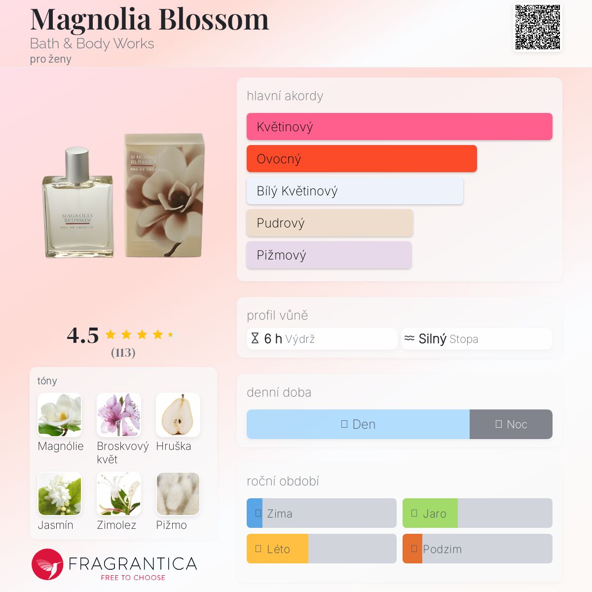 Magnolia Blossom podle Bath & Body Works je Floral vůně pro ženy. Vrchní tóny jsou Broskvový květ a Hruška; střední tóny jsouOkvětní lístky mólagnie, Jasmín, Zimolez a Růže ; základní tóny jsou Pižmo, Bílé santalové dřevo a Jantar (ambra).