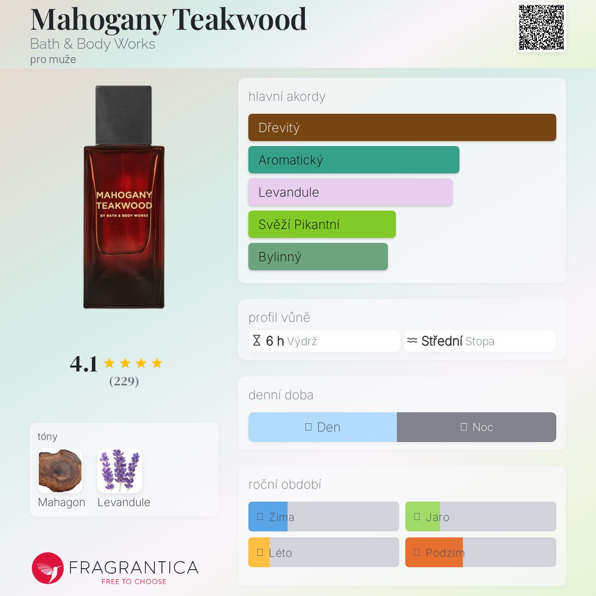 Mahogany Teakwood podle Bath & Body Works je Woody vůně pro muže. Mahogany Teakwood byl/a uveden/a v roce 2023.