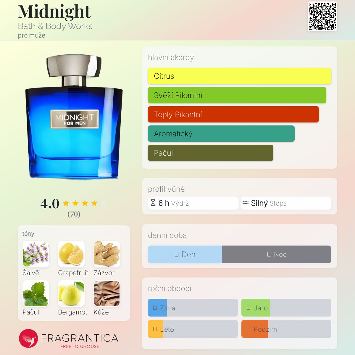 Midnight podle Bath & Body Works je Woody Spicy vůně pro muže. Midnight byl/a uveden/a v roce 2013. Vrchní tóny jsou Grapefruit, Bergamot, Černý pepř a Koření; střední tóny jsouModrá šalvěj, Zázvor a Muškátový oříšek ; základní tóny jsou Pačuli, Kůže, Karamel a Vzácné dřevo.