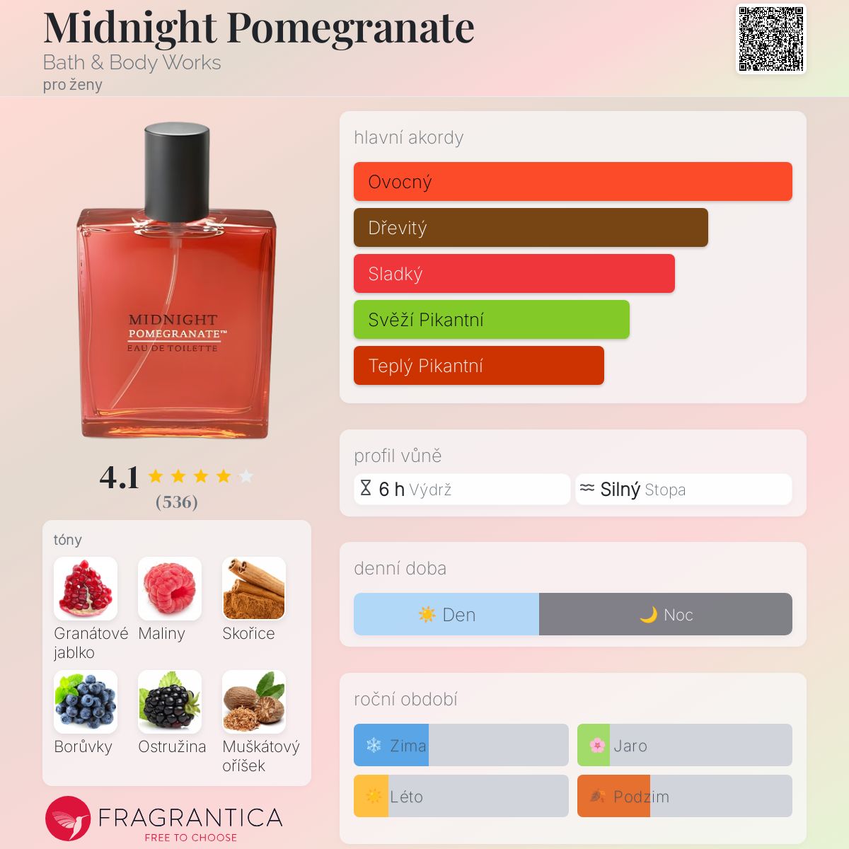 Midnight Pomegranate podle Bath & Body Works je Floral Fruity vůně pro ženy. Midnight Pomegranate byl/a uveden/a v roce 2007. Vrchní tóny jsou Granátové jablko, Skořice, Ostružina, Muškátový oříšek, Anýz a Citrusy; střední tóny jsouMaliny, Borůvky, Kasie, Jasmín a Kosatec ; základní tóny jsou Tabák, Vanilka, Pačuli, Santalové dřevo a Pižmo.