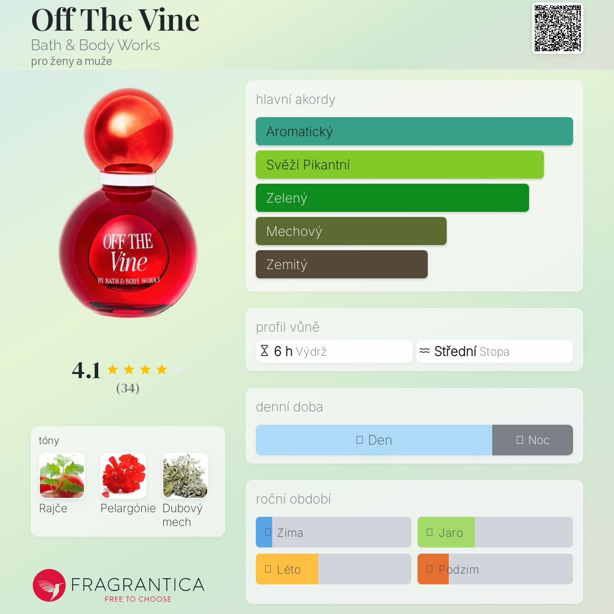 Off The Vine podle Bath & Body Works je Aromatic Fruity vůně pro ženy a muže. Toto je nová vůně. Off The Vine byl/a uveden/a v roce 2025.
