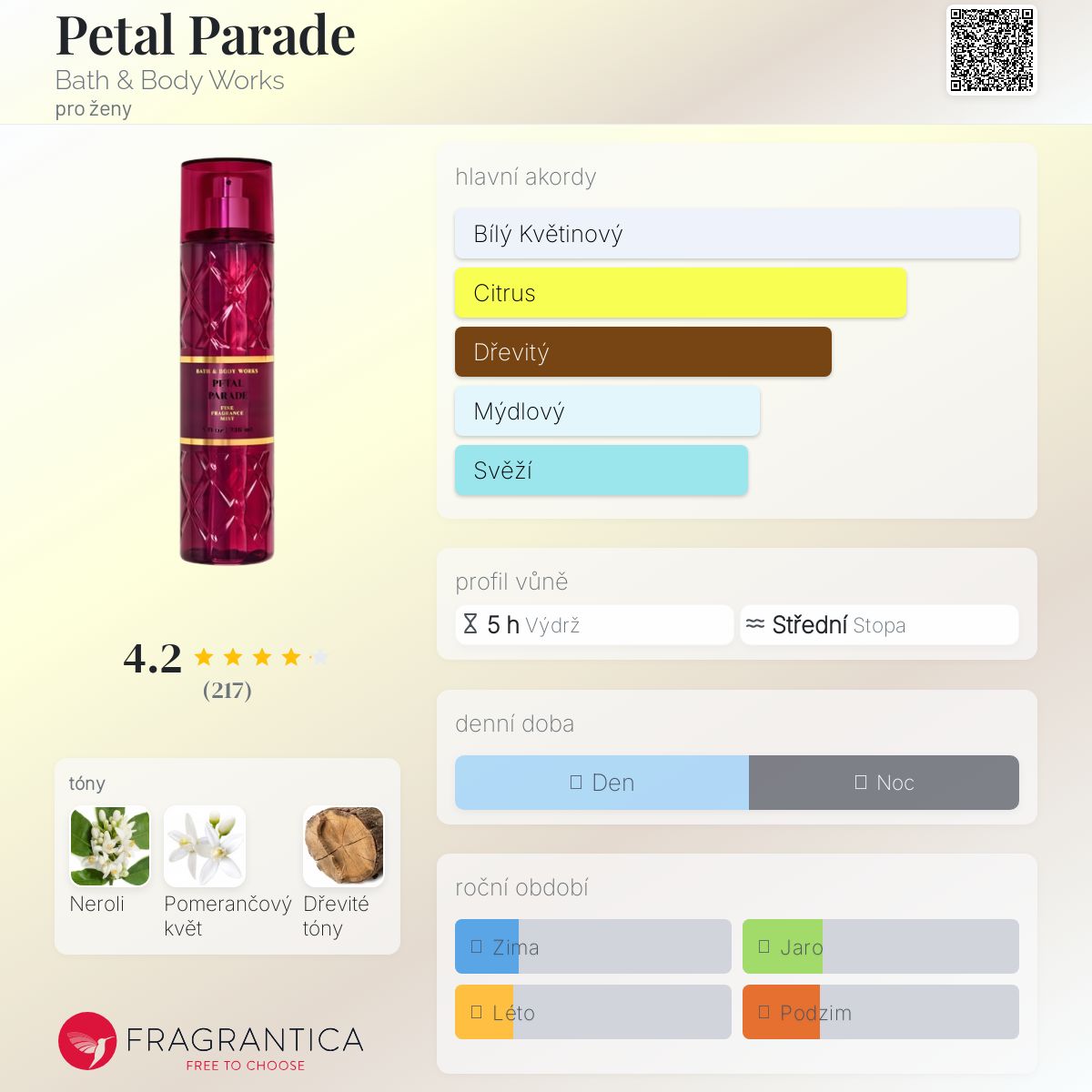 Petal Parade podle Bath & Body Works je Floral vůně pro ženy. Toto je nová vůně. Petal Parade byl/a uveden/a v roce 2024.