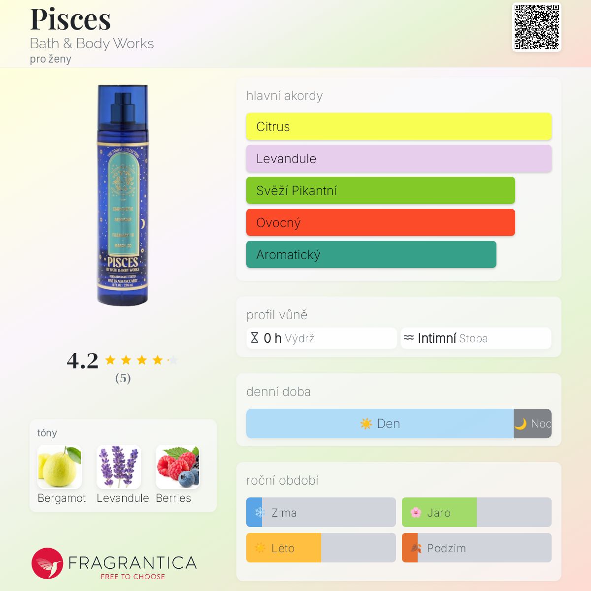 Pisces podle Bath & Body Works je Floral Fruity vůně pro ženy. Toto je nová vůně. Pisces byl/a uveden/a v roce 2025.