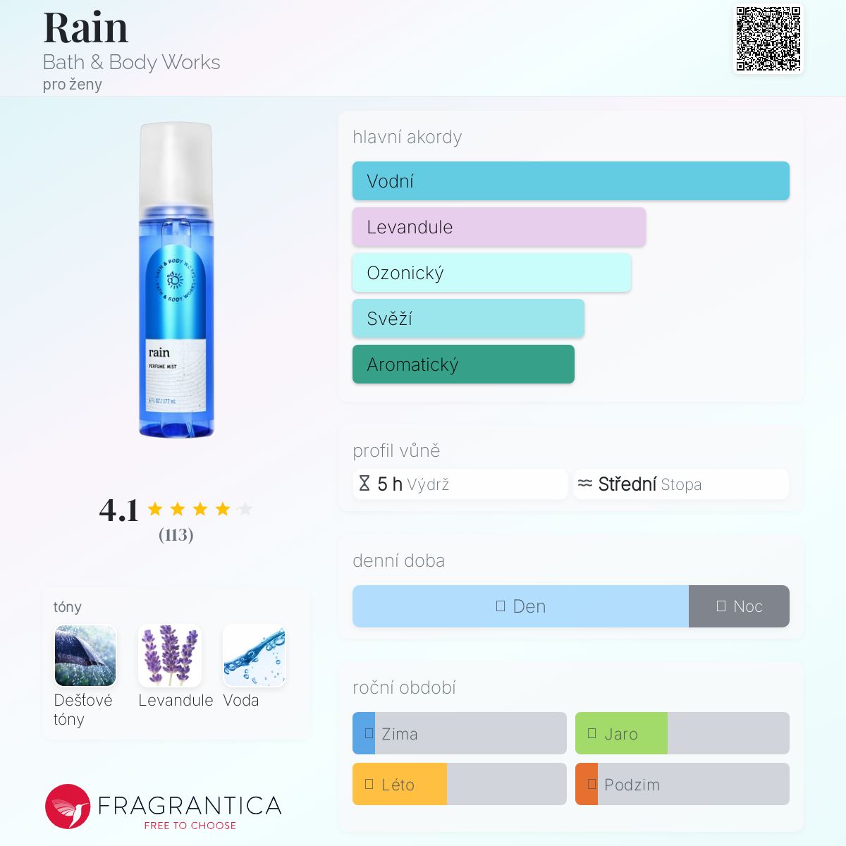 Rain podle Bath & Body Works je Aromatic Aquatic vůně pro ženy. Toto je nová vůně. Rain byl/a uveden/a v roce 2024.