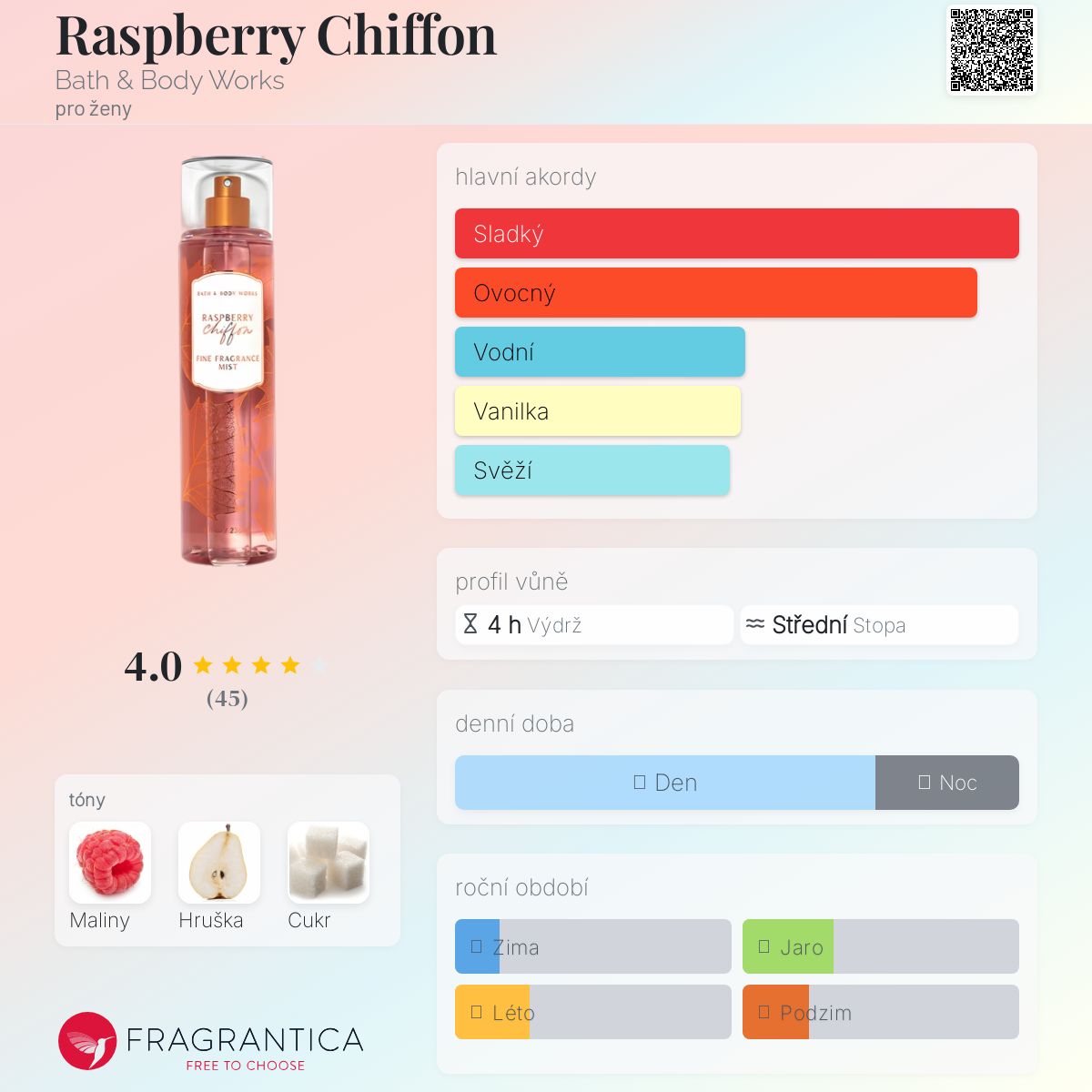 Raspberry Chiffon podle Bath & Body Works je Aromatic Fruity vůně pro ženy. Raspberry Chiffon byl/a uveden/a v roce 2021.