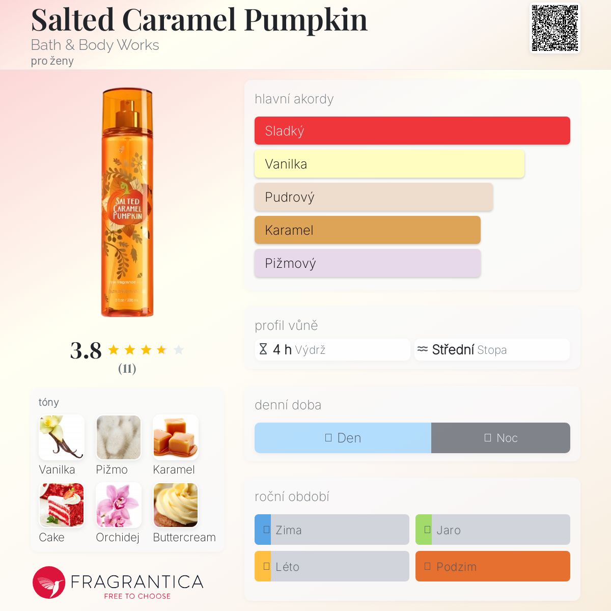 Salted Caramel Pumpkin podle Bath & Body Works je Floral Fruity Gourmand vůně pro ženy. Salted Caramel Pumpkin byl/a uveden/a v roce 2016. Vrchní tóny jsou Javor, Mandarinka a Jablko; střední tóny jsouKaramel, Orchidej, Máslový krém, Sůl a Dýně ; základní tóny jsou Vanilka, Pižmo, Dort, Creme Brulee, Dřevité tóny a Ananas.
