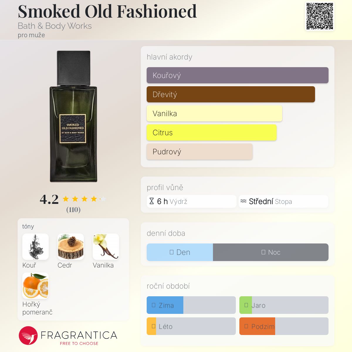 Smoked Old Fashioned podle Bath & Body Works je Woody vůně pro muže. Smoked Old Fashioned byl/a uveden/a v roce 2022. Vrchní tóny jsou Kouř a Hořký pomeranč; střední tón jeBourbonská vanilka ; základní tón je Cedr.
