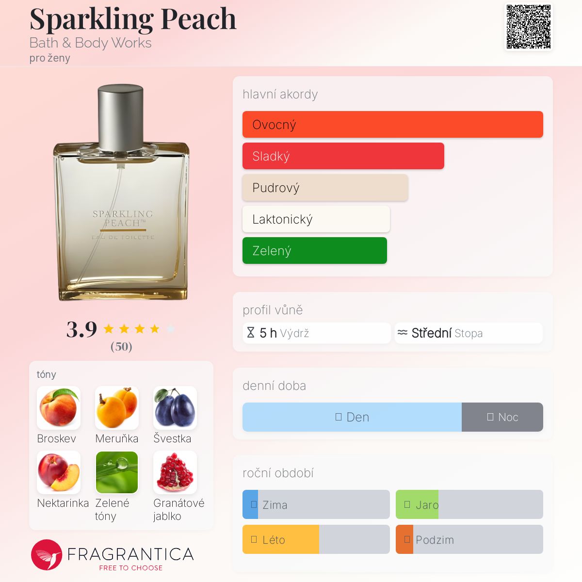 Sparkling Peach podle Bath & Body Works je Floral Fruity vůně pro ženy. Sparkling Peach byl/a uveden/a v roce 2007. Vrchní tóny jsou Broskev, Nektarinka, Granátové jablko a Černý rybíz; střední tóny jsouMeruňka, Broskev, Zelené tóny, Konvalinka a Jasmín ; základní tóny jsou Švestka, Santalové dřevo, Jantar (ambra) a Pižmo.