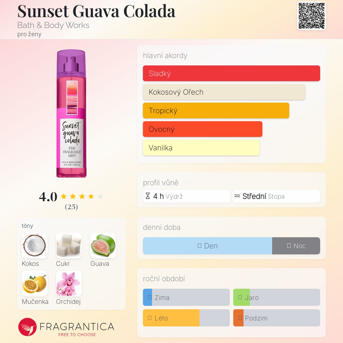 Sunset Guava Colada podle Bath & Body Works je Floral Fruity Gourmand vůně pro ženy. Sunset Guava Colada byl/a uveden/a v roce 2018.