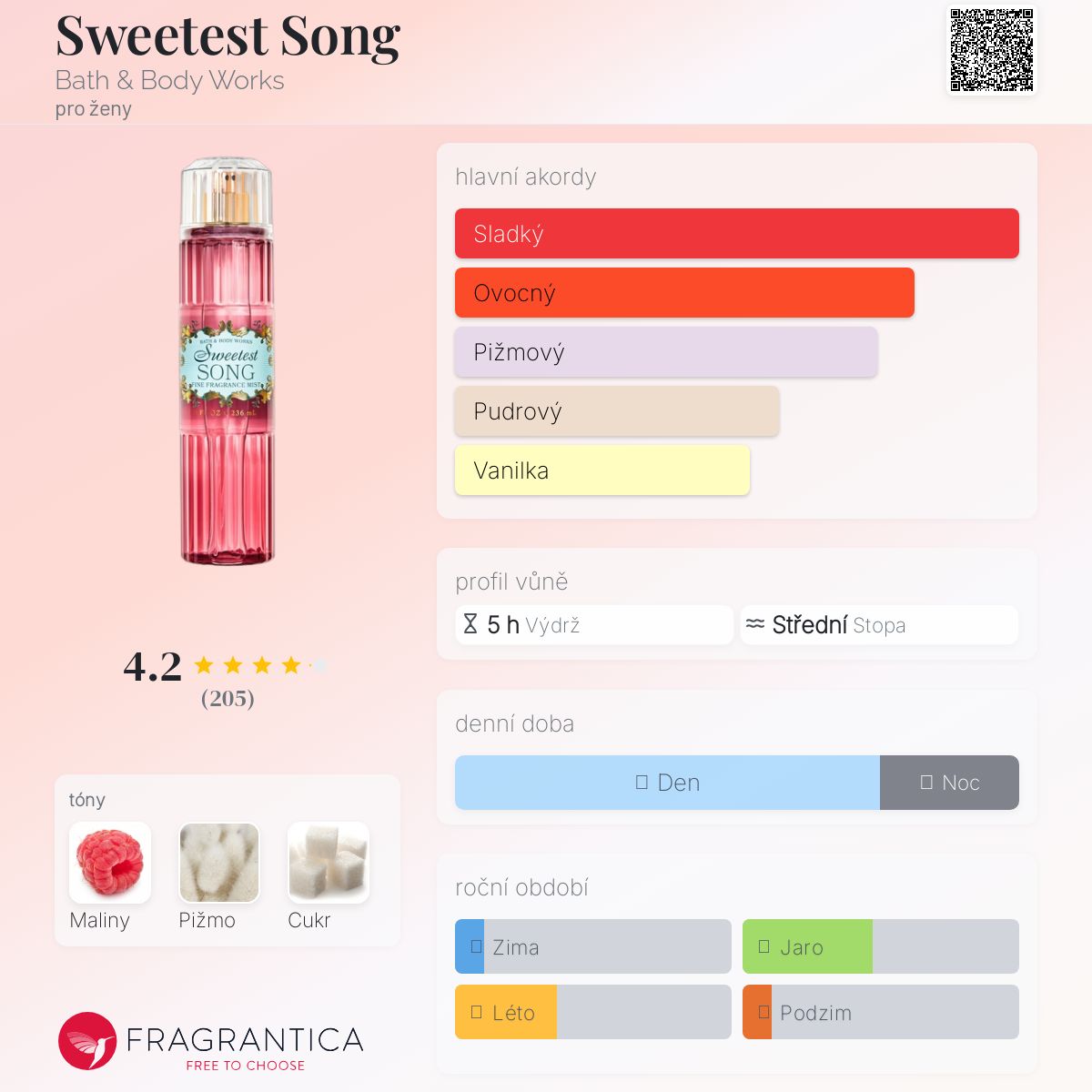 Sweetest Song podle Bath & Body Works je Floral Woody Musk vůně pro ženy. Toto je nová vůně. Sweetest Song byl/a uveden/a v roce 2025.