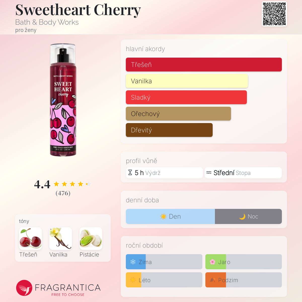 Sweetheart Cherry podle Bath & Body Works je Aromatic Fruity vůně pro ženy. Toto je nová vůně. Sweetheart Cherry byl/a uveden/a v roce 2024.