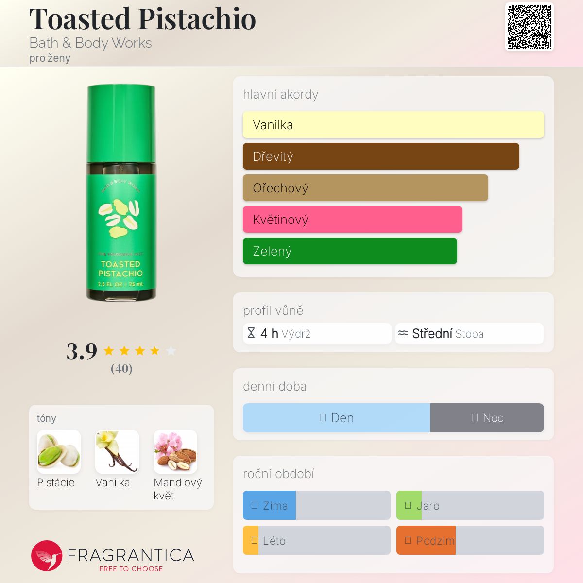 Toasted Pistachio podle Bath & Body Works je Floral Fruity Gourmand vůně pro ženy. Toto je nová vůně. Toasted Pistachio byl/a uveden/a v roce 2025.
