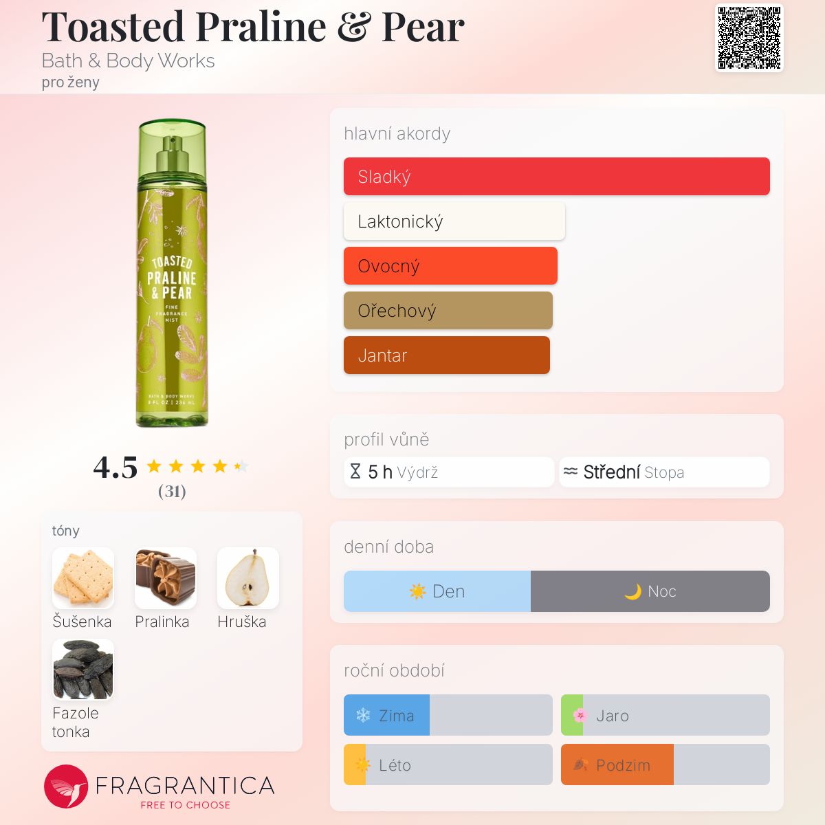Toasted Praline & Pear podle Bath & Body Works je Aromatic Fruity vůně pro ženy. Toasted Praline & Pear byl/a uveden/a v roce 2019. Toasted Praline & Pear byl/a vytvořen/a Sébastien Cresp a Gabriela Chelariu.