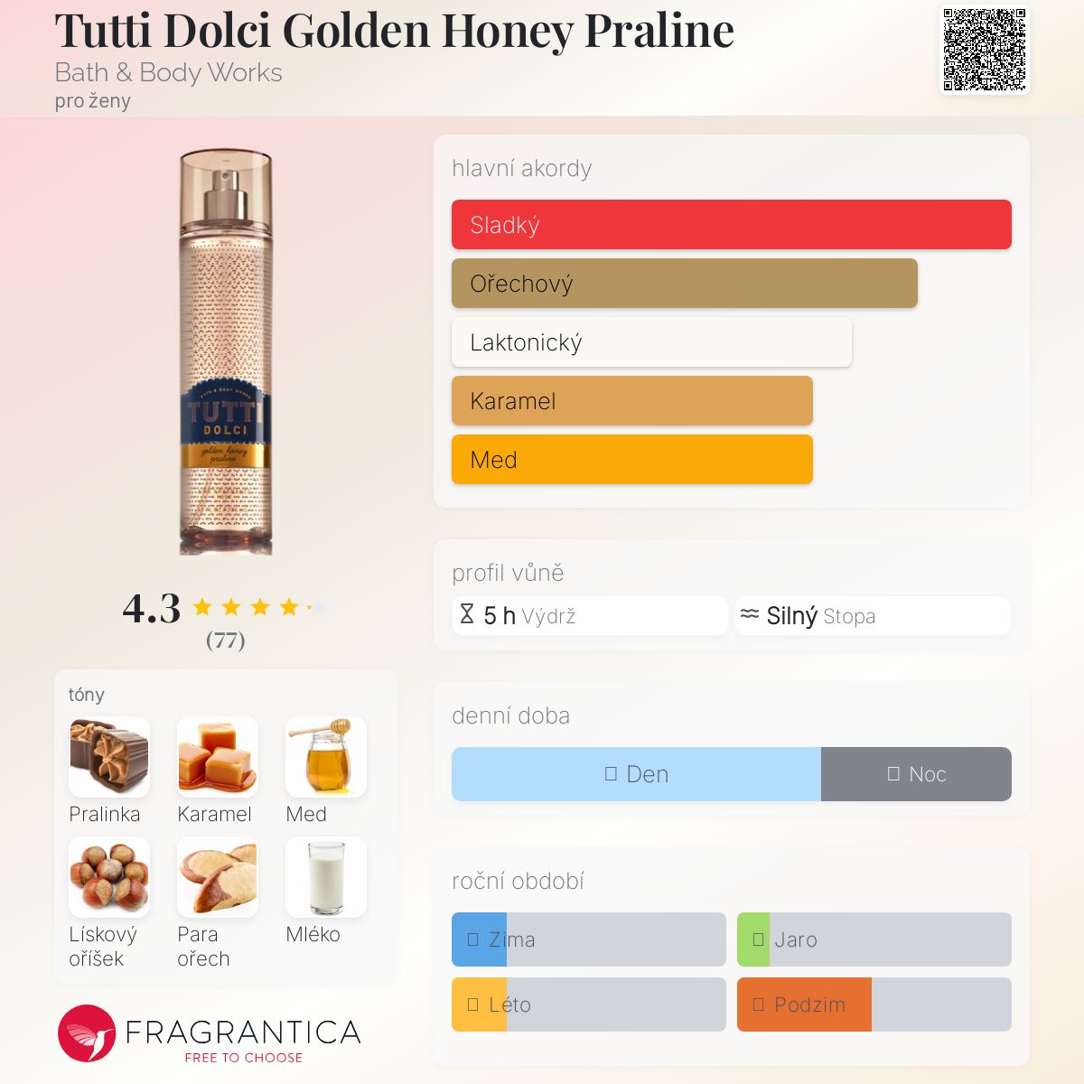 Tutti Dolci Golden Honey Praline podle Bath & Body Works je Orientální Vanilla vůně pro ženy. Tutti Dolci Golden Honey Praline byl/a uveden/a v roce 2016. Vrchní tóny jsou Lískový oříšek a Hruškový květ; střední tóny jsouKaramel, Para ořech, Mléko, Sůl a Jasmín ; základní tóny jsou Pralinka, Med, Pižmo a Fazole tonka.