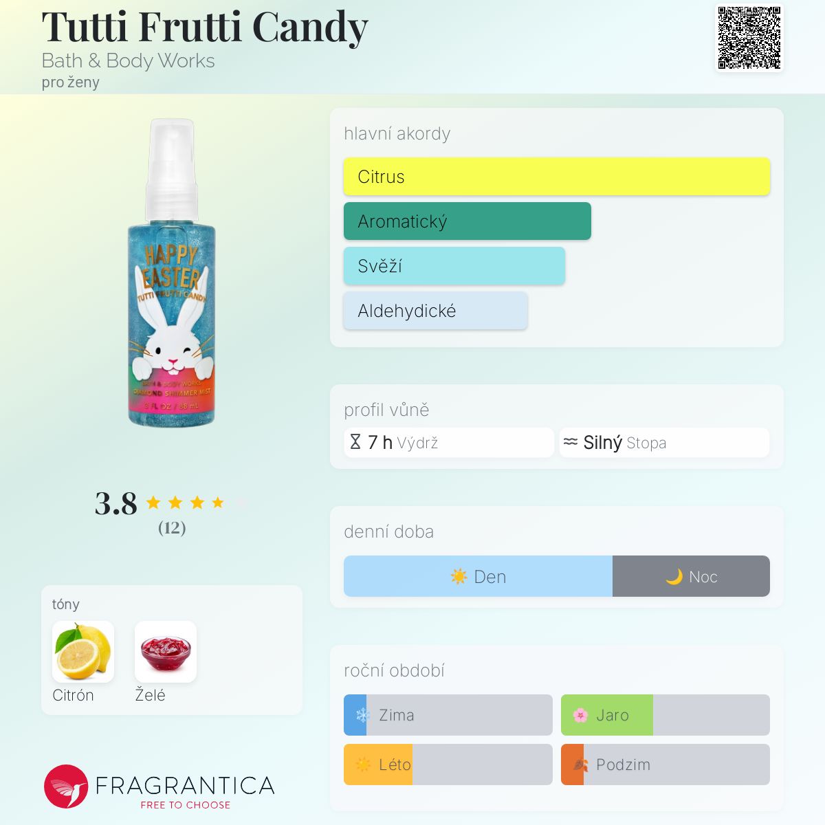 Tutti Frutti Candy podle Bath & Body Works je Floral Fruity vůně pro ženy. Tutti Frutti Candy byl/a uveden/a v roce 2023.