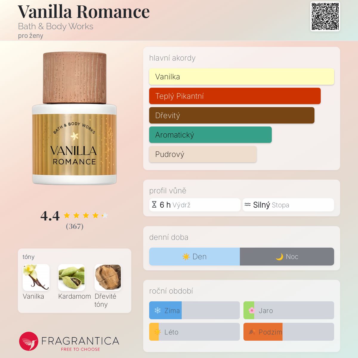 Vanilla Romance podle Bath & Body Works je Orientální Vanilla vůně pro ženy. Toto je nová vůně. Vanilla Romance byl/a uveden/a v roce 2024. Vanilla Romance byl/a vytvořen/a Honorine Blanc a Gabriela Chelariu.