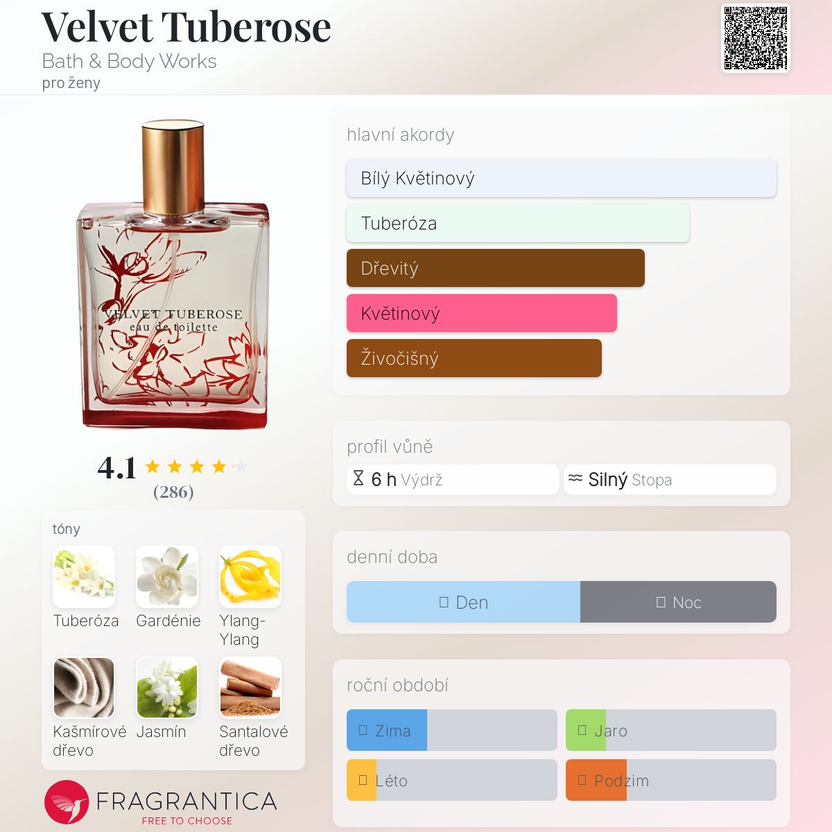 Velvet Tuberose podle Bath & Body Works je Floral vůně pro ženy. Velvet Tuberose byl/a uveden/a v roce 2007. Vrchní tóny jsou Ylang-Ylang, Magnólie, Šťavnatá meruňka a Citrón; střední tóny jsouTuberóza, Gardénie, Indický jasmín, Orchidej, Frézie, Fíkový list a Brambořík ; základní tóny jsou Kašmírové dřevo, Santalové dřevo, Koření, Pižmo a Jantar (ambra).