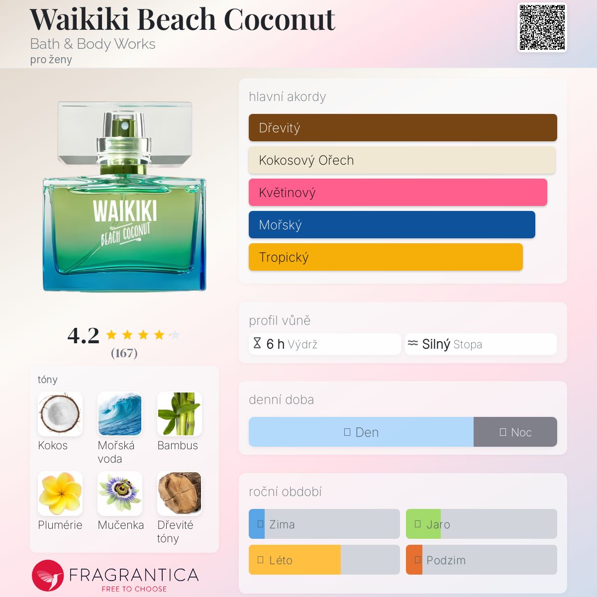 Waikiki Beach Coconut podle Bath & Body Works je Floral Fruity vůně pro ženy. Waikiki Beach Coconut byl/a uveden/a v roce 2015. Vrchní tóny jsou Kokos, Mořské tóny a Bambus; střední tóny jsouKokos, Plumérie, Mučenka a Jasmín ; základní tóny jsou Dřevité tóny a Santalové dřevo.