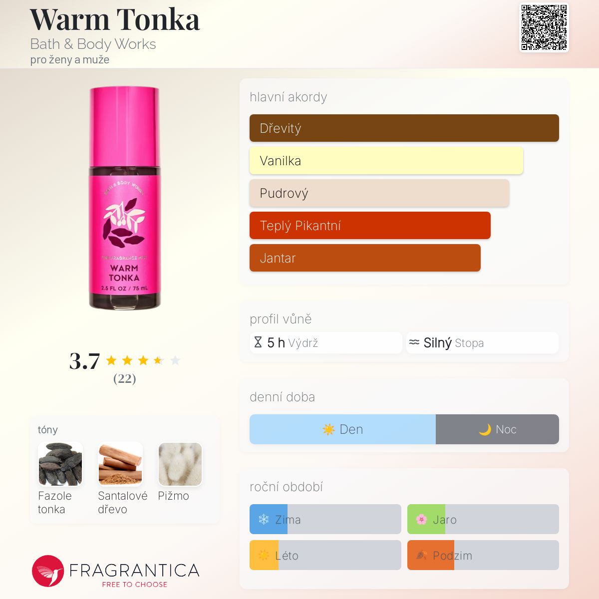 Warm Tonka podle Bath & Body Works je Woody Aromatic vůně pro ženy a muže. Toto je nová vůně. Warm Tonka byl/a uveden/a v roce 2025.