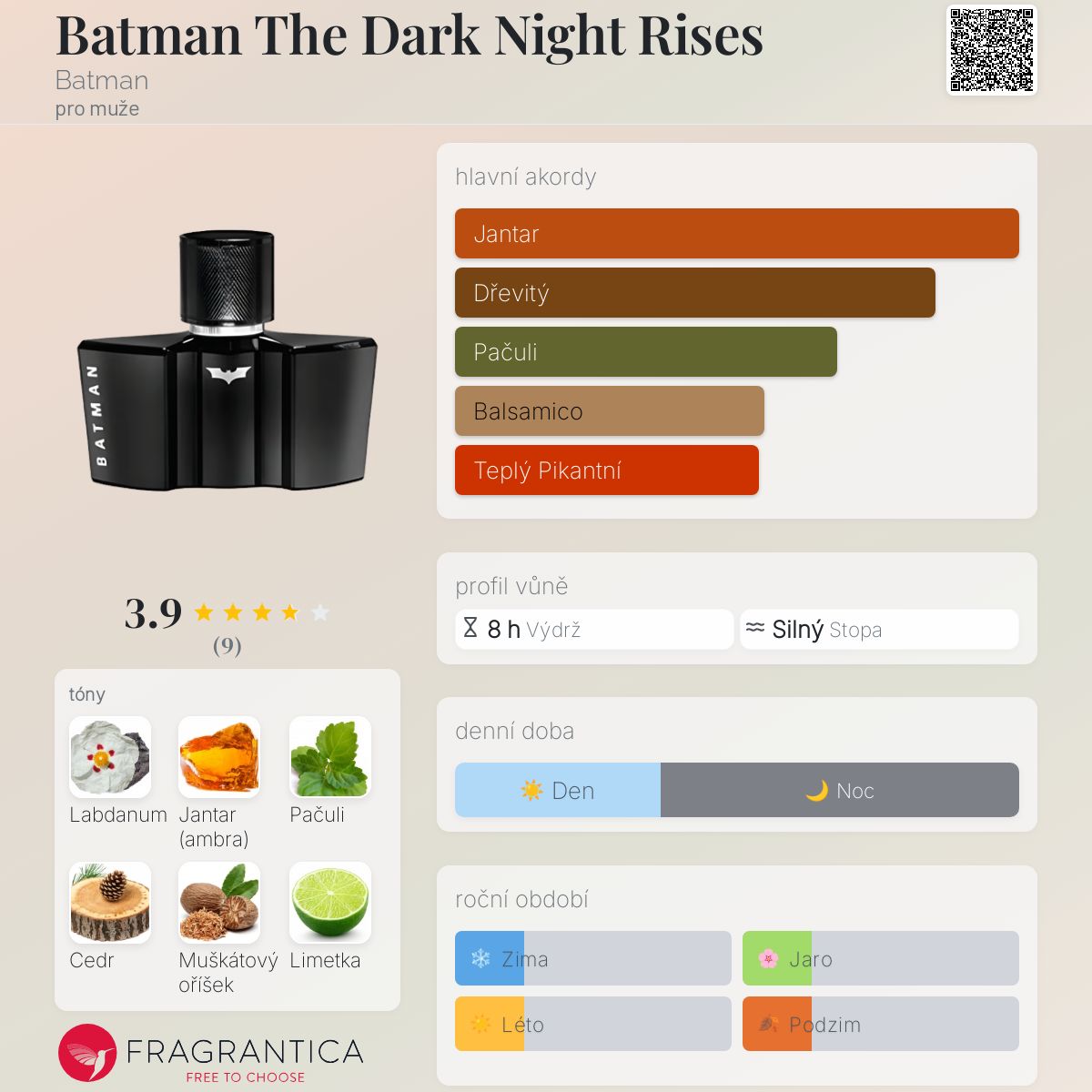 Batman The Dark Night Rises podle Batman je Woody Spicy vůně pro muže. Batman The Dark Night Rises byl/a uveden/a v roce 2016. Vrchní tóny jsou Cedr a Limetka; střední tóny jsouLabdanum a Muškátový oříšek ; základní tóny jsou Jantar (ambra) a Pačuli.