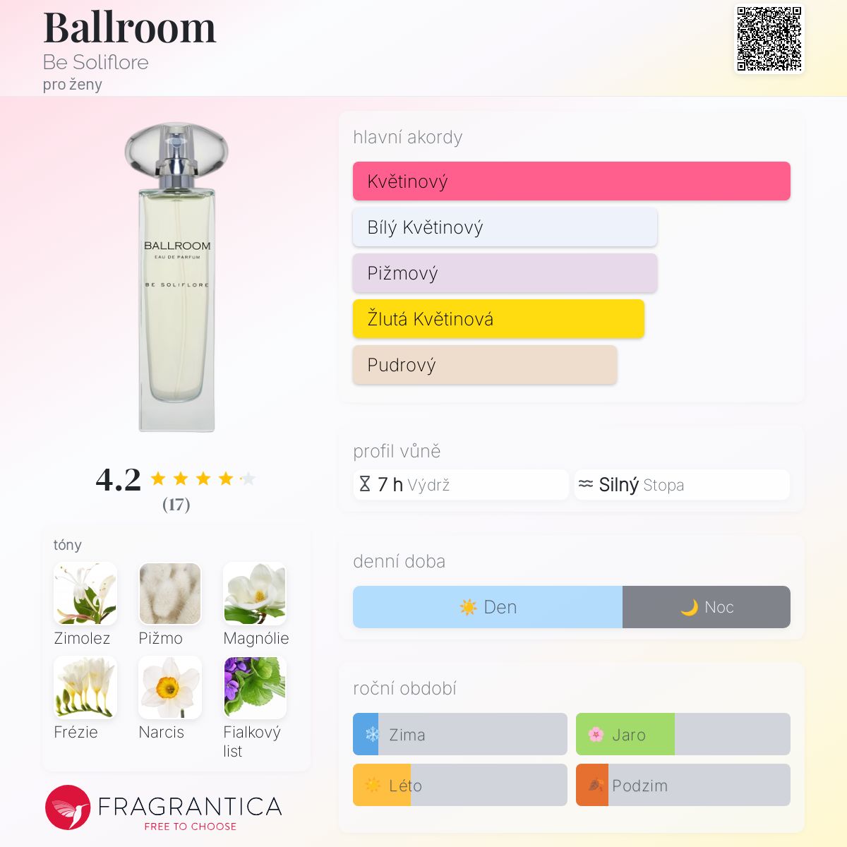 Ballroom podle Be Soliflore je Floral vůně pro ženy. Ballroom byl/a uveden/a v roce 2019. "Nosem" za touto vůní je Constance Georges-Picot. Vrchní tóny jsou Zimolez, Magnólie a Žlutý narcis; střední tóny jsouFrézie, Damašská růže a Palisandr ; základní tóny jsou Pižmo, Fialkový list a Kosatec.