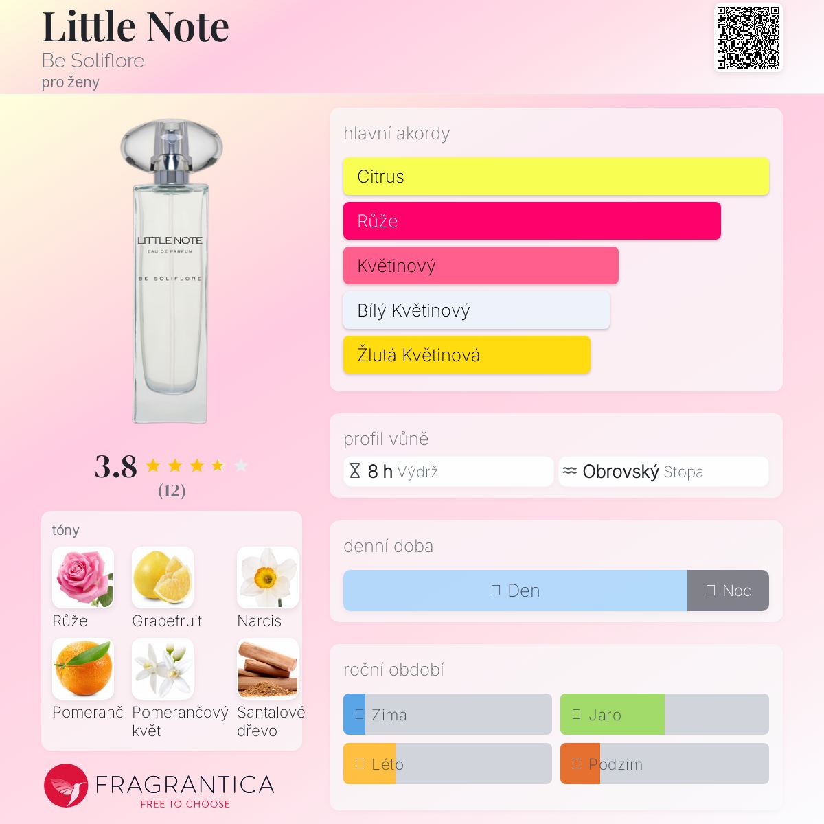 Little Note podle Be Soliflore je Floral Fruity vůně pro ženy. Little Note byl/a uveden/a v roce 2019. "Nosem" za touto vůní je Arnaud Winter. Vrchní tóny jsou Grapefruit, Narcis a Pomerančová slupka; střední tóny jsouPomerančový květ, Konvalinka a Magnólie ; základní tóny jsou Růže, Santalové dřevo a Bílé pižmo.