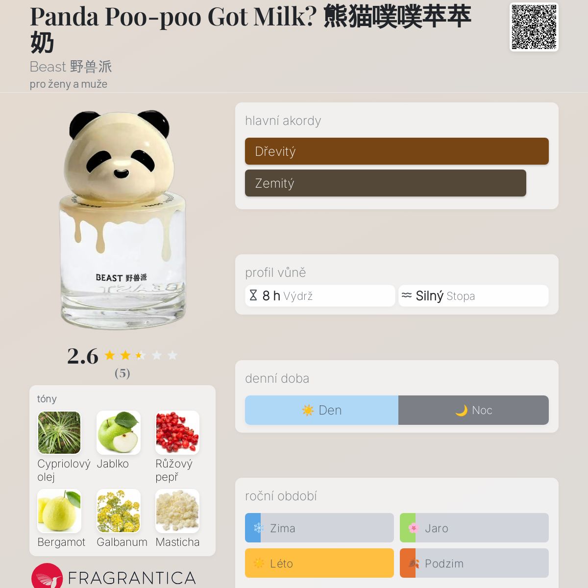 Panda Poo-poo Got Milk? 熊猫噗噗苹苹奶 podle Beast 野兽派 je vůně pro ženy a muže. Vrchní tóny jsou Granny Smith jablko, Růžový pepř, Bergamot, Galbanum a Masticha; střední tóny jsouKonvalinka, Jasmín a Ambrette (přírodní pižmo) ; základní tóny jsou Cypriolový olej, Santalové dřevo, Ambra, Vetiver, Pižmo, Mléko a Mech.