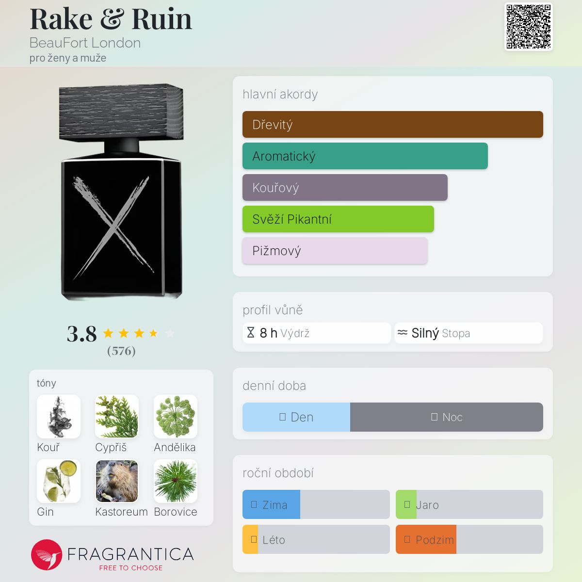 Rake & Ruin podle BeauFort London je vůně pro ženy a muže. Rake & Ruin byl/a uveden/a v roce 2018. "Nosem" za touto vůní je Julie Dunkley. Vrchní tóny jsou Kouř, Andělika, Gin, Jalovec, Sečuánský pepř, Růžový pepř, Lékořice, Koriandr, Citrón a Pomeranč; střední tóny jsouKouř, Cypřiš, Kastoreum, Jehličí borovice, Cade olej, Labdanum, Chrpovník lopuchový, Orris a Fialka ; základní tóny jsou Kouř, Dřevité tóny, Ambrarom, Santalové dřevo a Pižmo.