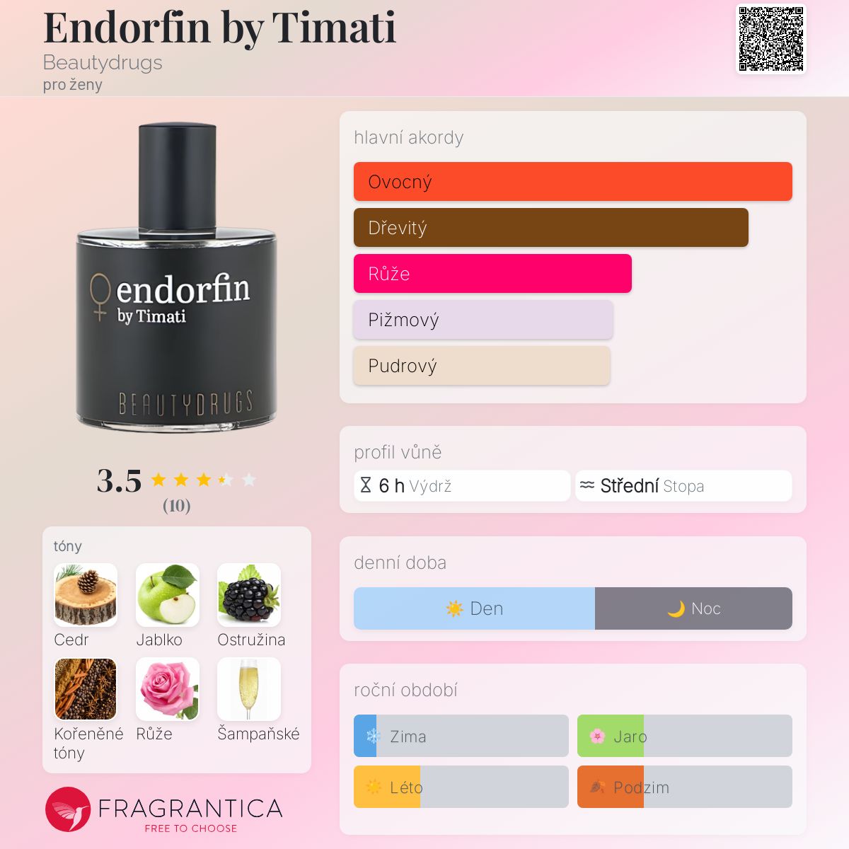 Endorfin by Timati podle Beautydrugs je Floral Fruity vůně pro ženy. Endorfin by Timati byl/a uveden/a v roce 2016. Vrchní tóny jsou Cedr, Jablko a Kořeněné tóny; střední tóny jsouOstružina a Okvětní lístky růží ; základní tóny jsou Šampaňské a Pižmo.
