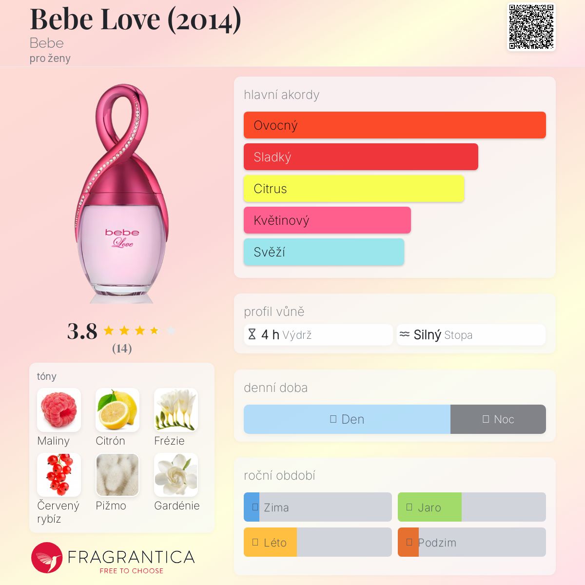 Bebe Love (2014) podle Bebe je Floral Fruity vůně pro ženy. Bebe Love (2014) byl/a uveden/a v roce 2014. Vrchní tóny jsou Sicilský citron, Růžová frézie a Červený rybíz; střední tóny jsouMaliny, Gardénie, Guava a Brambořík ; základní tóny jsou Pižmo, Dřevité tóny, Cedr a Jantar (ambra).
