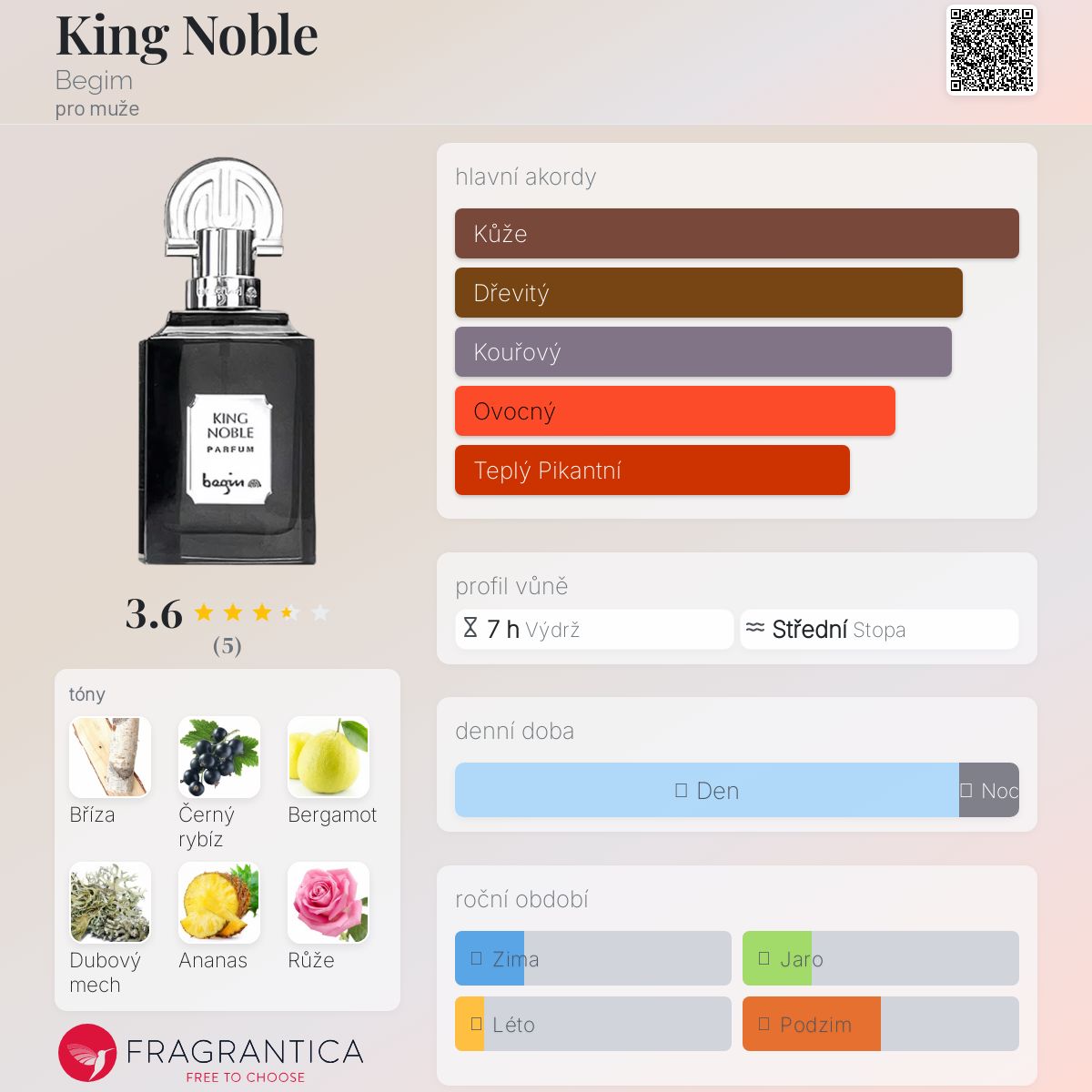 King Noble podle Begim je vůně pro muže. Toto je nová vůně. King Noble byl/a uveden/a v roce 2022. Vrchní tóny jsou Černý rybíz, Bergamot, Dubový mech a Ananas; střední tóny jsouBříza, Růže, Marocký jasmín, Pačuli a Kardamom ; základní tóny jsou Vanilka, Pižmo, Dubový mech a Ambra.