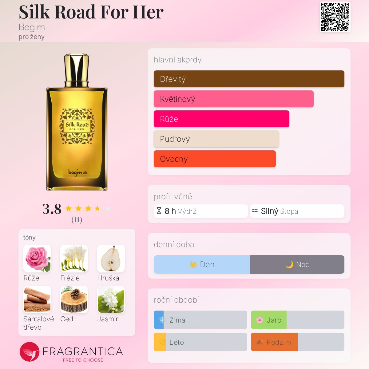 Silk Road For Her podle Begim je Floral Woody Musk vůně pro ženy. Silk Road For Her byl/a uveden/a v roce 2018. "Nosem" za touto vůní je Hamid Merati-Kashani. Vrchní tóny jsou Růže, Frézie a Jasmín; střední tóny jsouHruška a Růžový pepř ; základní tóny jsou Santalové dřevo, Cedr, Pačuli a Pižmo.