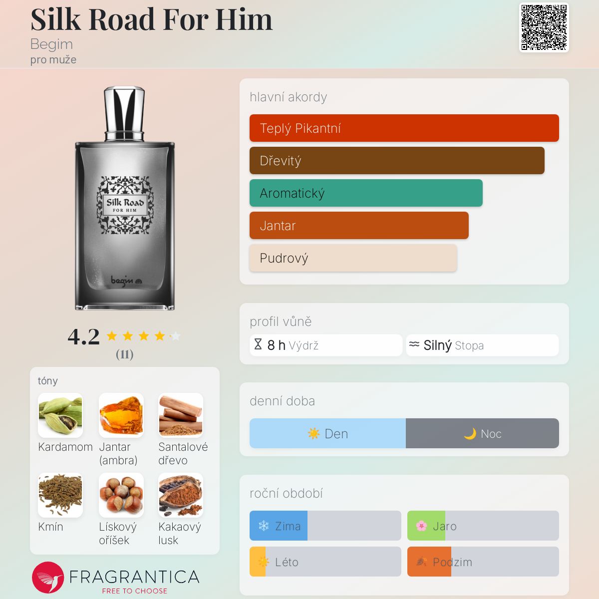 Silk Road For Him podle Begim je Orientální Spicy vůně pro muže. Silk Road For Him byl/a uveden/a v roce 2018. "Nosem" za touto vůní je Hamid Merati-Kashani. Vrchní tóny jsou Kmín, Lískový oříšek a Kakao; střední tóny jsouKardamom, Jantar (ambra) a Kůže ; základní tóny jsou Santalové dřevo, Cedr a Pižmo.