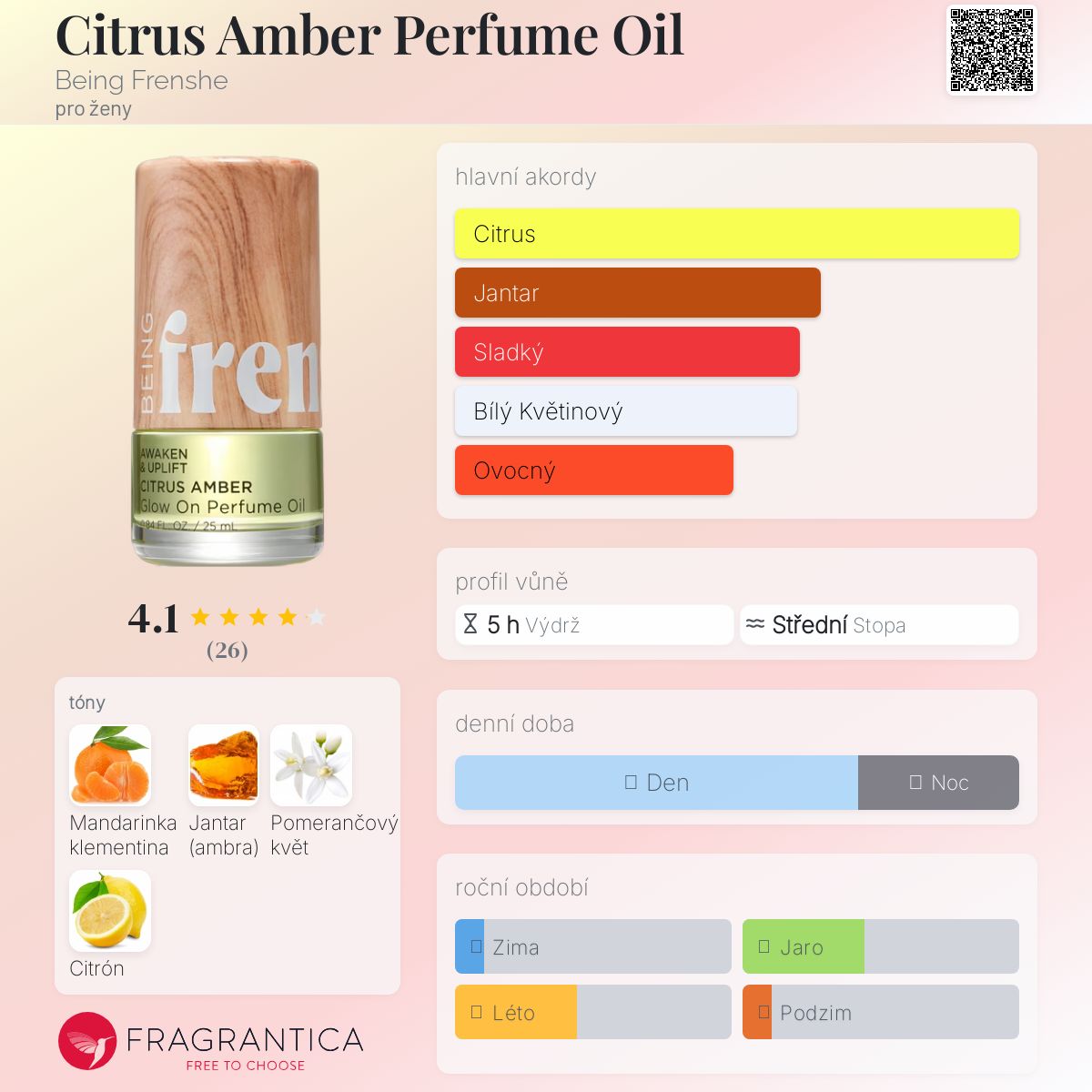Citrus Amber Perfume Oil podle Being Frenshe je Citrus vůně pro ženy. Citrus Amber Perfume Oil byl/a uveden/a v roce 2022.