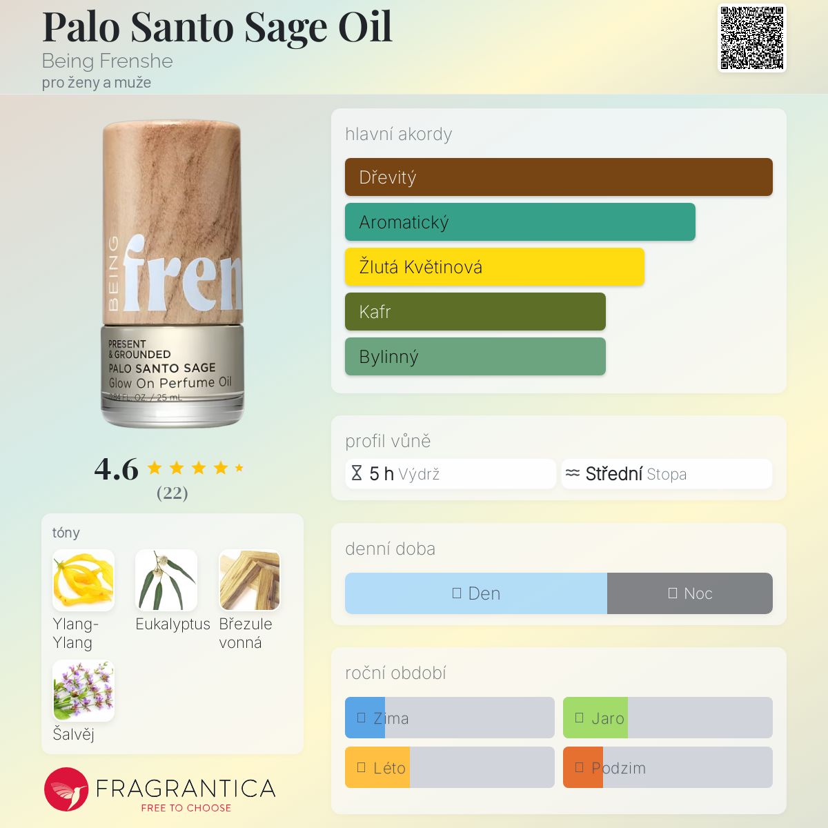 Palo Santo Sage Oil podle Being Frenshe je Woody Aromatic vůně pro ženy a muže. Toto je nová vůně. Palo Santo Sage Oil byl/a uveden/a v roce 2024.