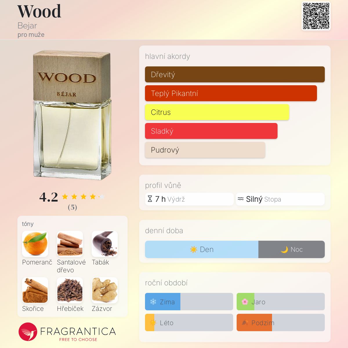 Wood podle Bejar je Orientální Woody vůně pro muže. "Nosem" za touto vůní je Ramón Béjar. Vrchní tóny jsou Pomeranč, Skořice, Hřebíček, Zázvor, Pomerančový květ a Růže; střední tóny jsouTabák, Koriandr, Eben, Pačuli a Borovice ; základní tóny jsou Santalové dřevo, Med, Vanilka, Benzoin, Jantar (ambra) a Pižmo.