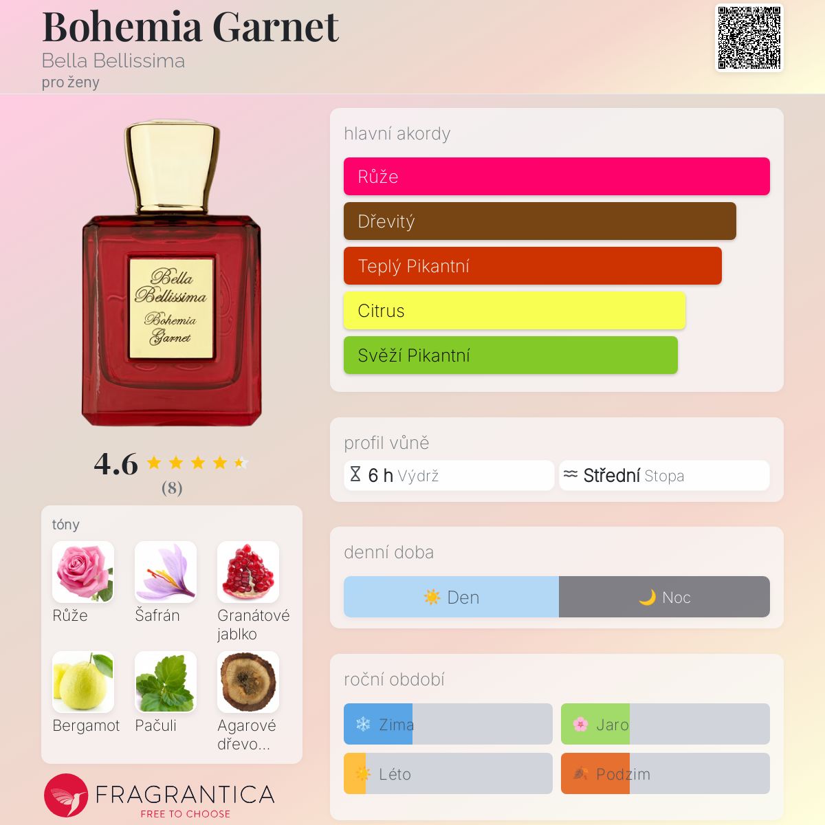 Bohemia Garnet podle Bella Bellissima je Orientální Floral vůně pro ženy. Bohemia Garnet byl/a uveden/a v roce 2015. Vrchní tóny jsou Granátové jablko, Bergamot, Maliny, Citrón a Pomeranč; střední tóny jsouDamašská růže, Šafrán, Jasmín, Pelargónie a Pomerančový květ ; základní tóny jsou Pačuli, Agarové dřevo (oud), Papyrus, Jantar (ambra), Pižmo, Santalové dřevo a Vanilka.