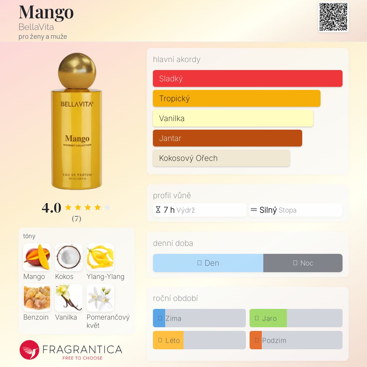 Mango podle BellaVita je vůně pro ženy a muže. Toto je nová vůně. Mango byl/a uveden/a v roce 2025. Vrchní tóny jsou Mango, Pomerančový květ a Orris; střední tóny jsouKokos, Ylang-Ylang a Jantar (ambra) ; základní tóny jsou Siamský (thajský) benzoin, Vanilka a Santalové dřevo.