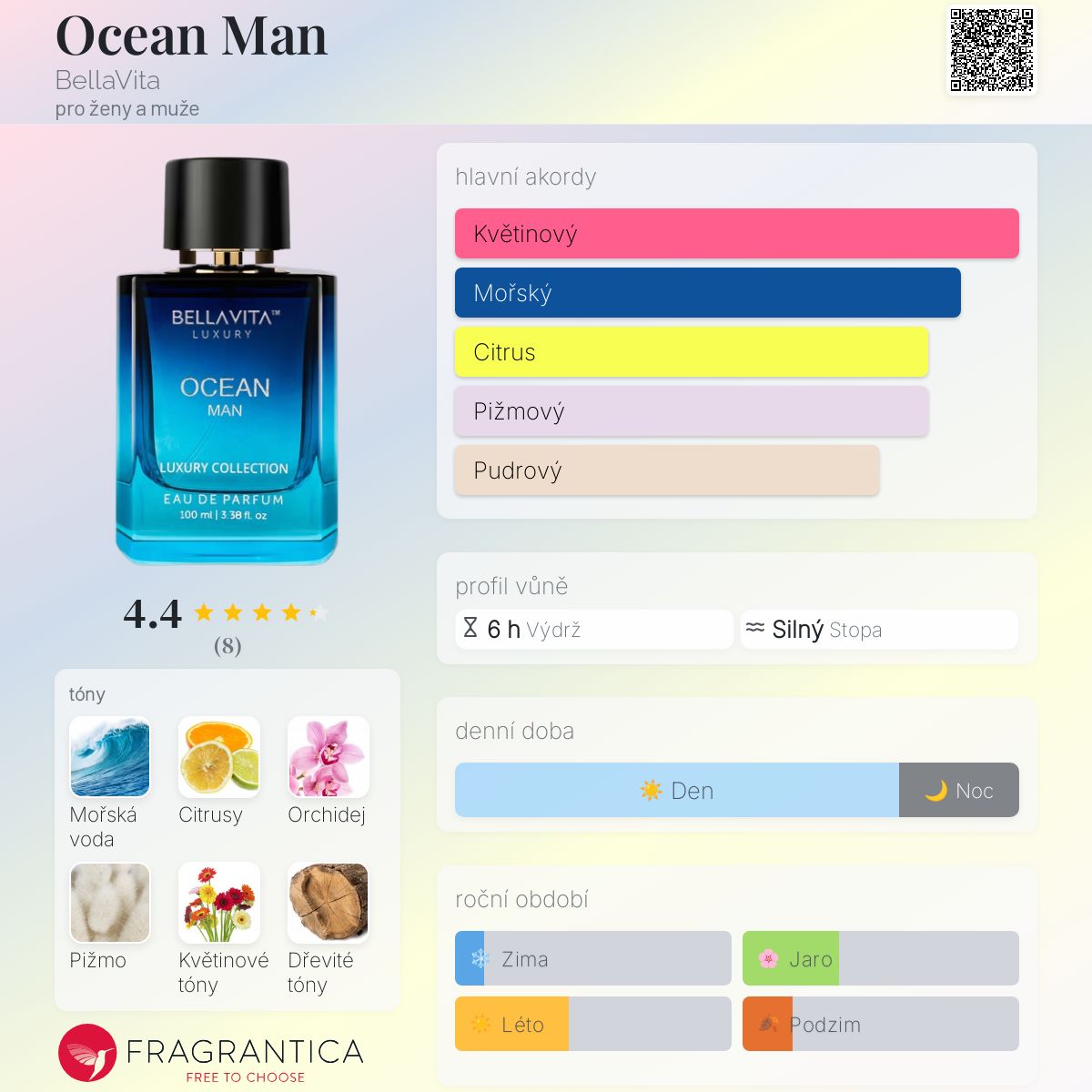 Ocean Man podle BellaVita je vůně pro ženy a muže. Ocean Man byl/a uveden/a v roce 2023. Vrchní tóny jsou Vodní tóny, Citrusy a Sůl; střední tóny jsouOrchidej a Květinové tóny ; základní tóny jsou Pižmo a Dřevité tóny.