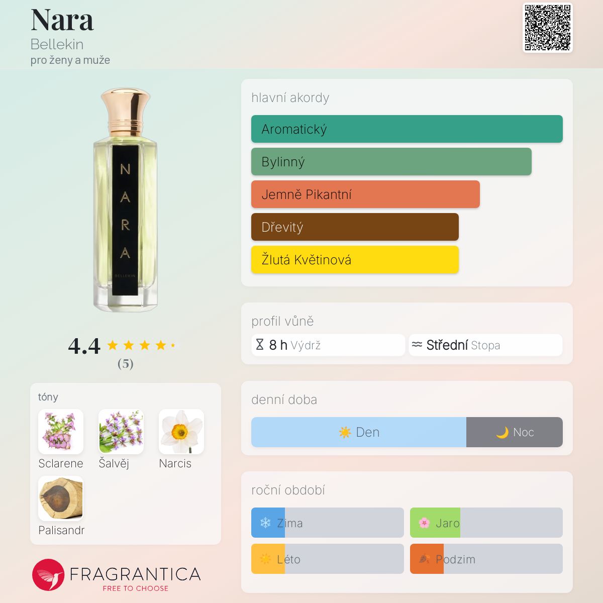 Nara podle Bellekin je vůně pro ženy a muže. Nara byl/a uveden/a v roce 2023. Vrchní tón je Šalvěj ; střední tón jeNarcis ; základní tóny jsou Sclarene a Palisandr.