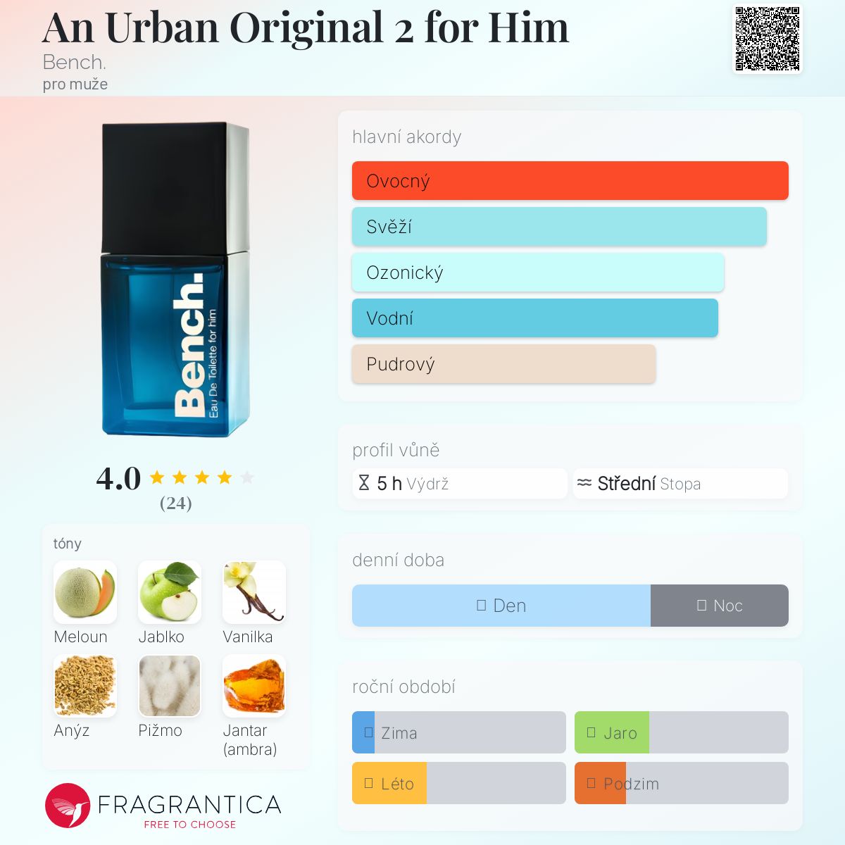 An Urban Original 2 for Him podle Bench. je Aromatic vůně pro muže. An Urban Original 2 for Him byl/a uveden/a v roce 2013. Vrchní tóny jsou Meloun, Jablko, Anýz, Citrón, Bergamot a Fialka; střední tóny jsouJasmín, Růže, Grapefruit, Levandule a Pačuli ; základní tóny jsou Vanilka, Pižmo, Jantar (ambra) a Santalové dřevo.