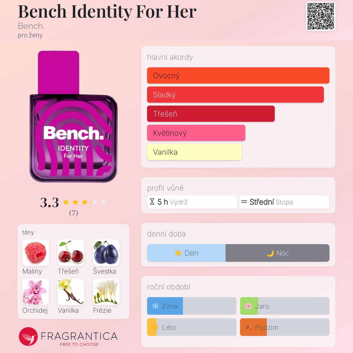 Bench Identity For Her podle Bench. je vůně pro ženy. Bench Identity For Her byl/a uveden/a v roce 2023. Vrchní tóny jsou Maliny, Třešeň a Švestka; střední tóny jsouOrchidej, Frézie a Kosatec ; základní tóny jsou Vanilka, Jantar (ambra) a Pižmo.