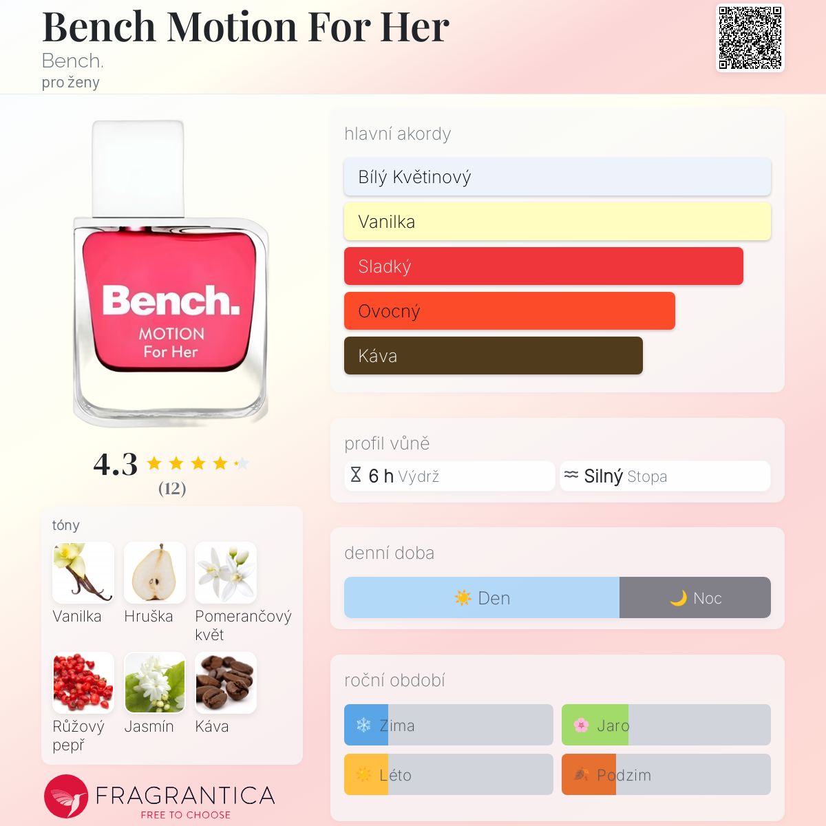 Bench Motion For Her podle Bench. je Floral Fruity Gourmand vůně pro ženy. Bench Motion For Her byl/a uveden/a v roce 2019. Vrchní tóny jsou Hruška, Pomerančový květ a Růžový pepř; střední tóny jsouJasmín a Káva ; základní tóny jsou Vanilka, Pačuli a Cedr.