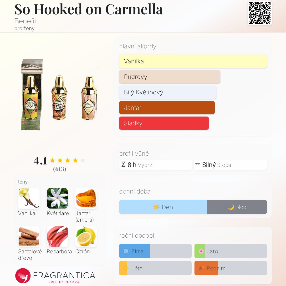 So Hooked on Carmella podle Benefit je Orientální Floral vůně pro ženy. So Hooked on Carmella byl/a uveden/a v roce 2010. Vrchní tóny jsou Rebarbora, Citron amalfi a Grapefruit; střední tóny jsouKvět tiare, Brambořík a Pivoňka ; základní tóny jsou Vanilka, Jantar (ambra) a Santalové dřevo.