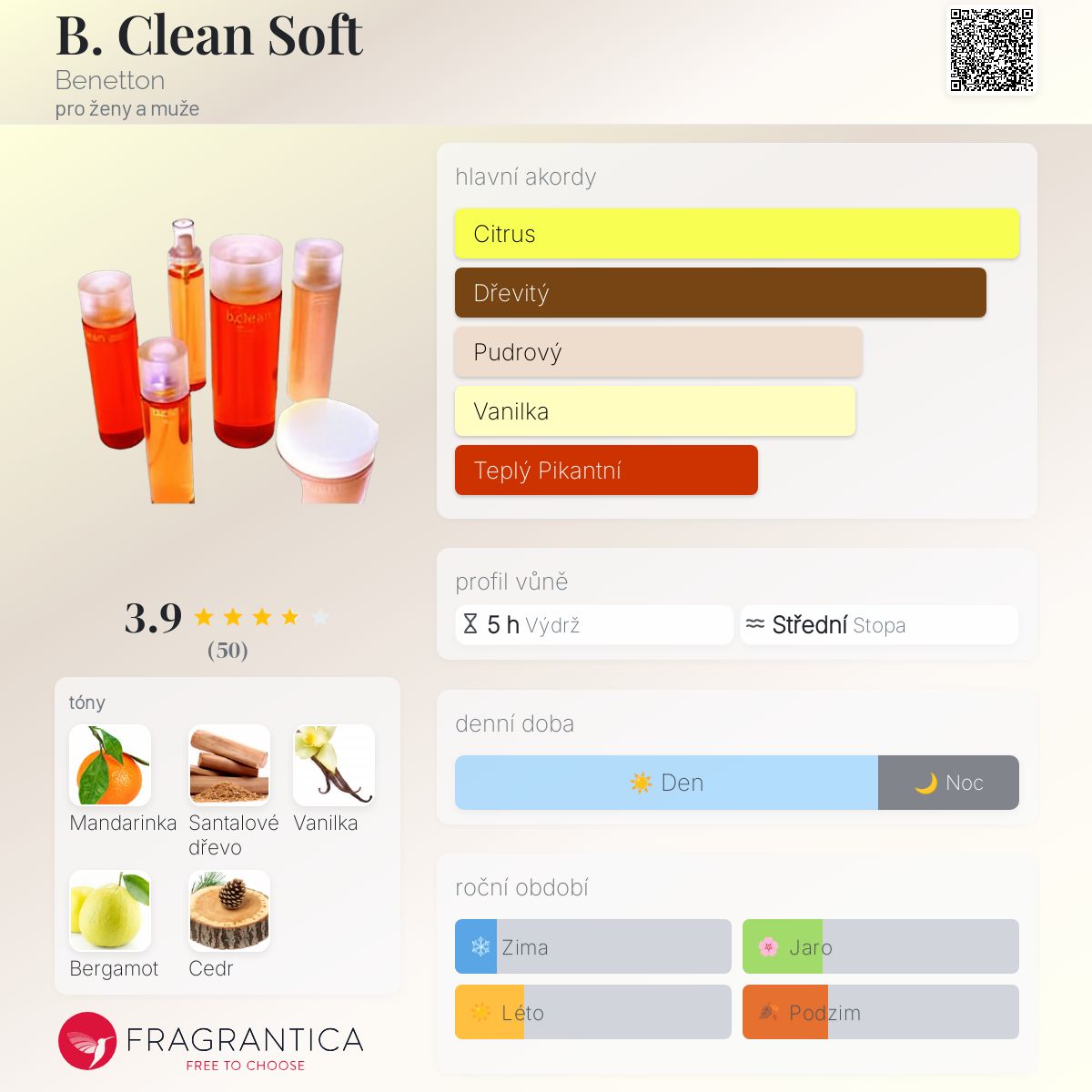B. Clean Soft podle Benetton je Citrus Aromatic vůně pro ženy a muže. B. Clean Soft byl/a uveden/a v roce 2002. Vrchní tóny jsou Mandarinka a Bergamot; základní tóny jsou Santalové dřevo, Vanilka a Cedr.