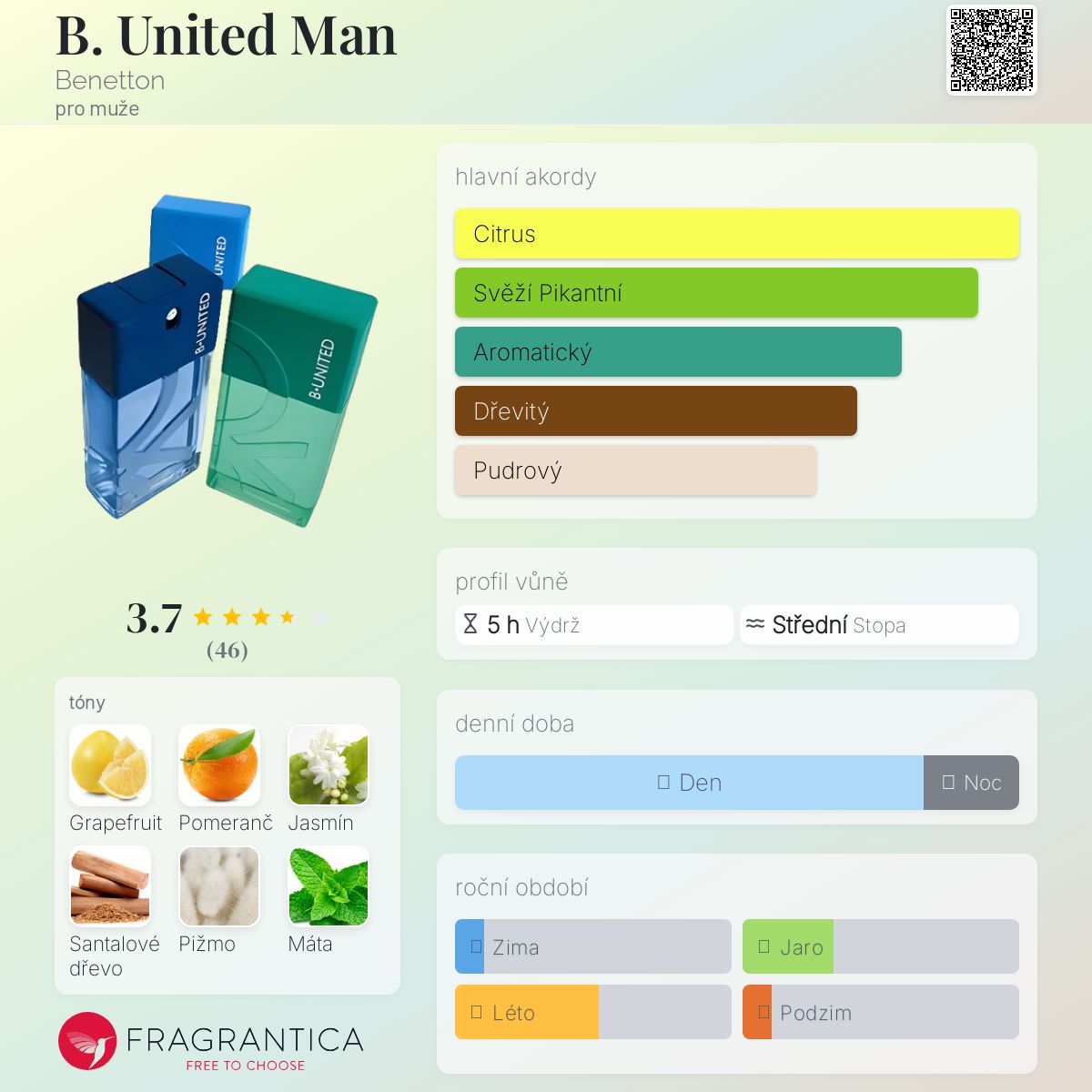 B. United Man podle Benetton je Aromatic vůně pro muže. B. United Man byl/a uveden/a v roce 2004. "Nosem" za touto vůní je Valerie Garnuch-Mentzel. Vrchní tóny jsou Grapefruit, Pomeranč, Máta a Kardamom; střední tóny jsouJasmín, Pelargónie, Muškátový oříšek, Levandule a Hřebíček ; základní tóny jsou Santalové dřevo, Bílé pižmo a Cedr.