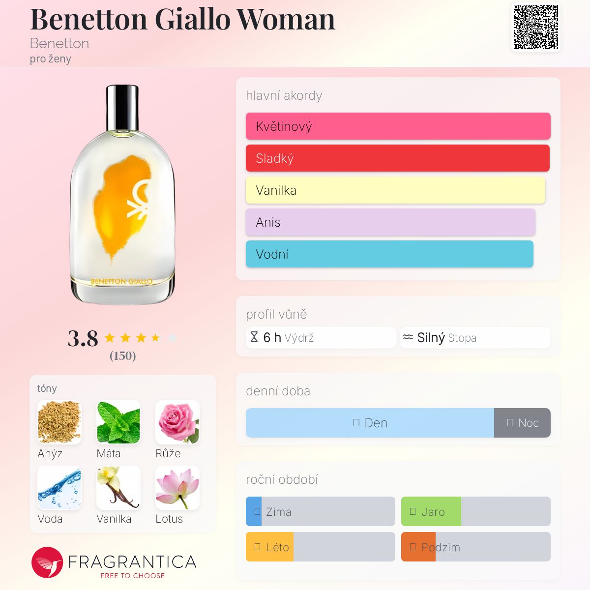 Benetton Giallo Woman podle Benetton je Floral Fruity vůně pro ženy. Benetton Giallo Woman byl/a uveden/a v roce 2010. Vrchní tóny jsou Anýz, Máta, Vodní tóny a Červené bobule; střední tóny jsouRůže, Lotus, Fialka a Broskev ; základní tóny jsou Vanilka, Fazole tonka, Pižmo a Dřevité tóny.